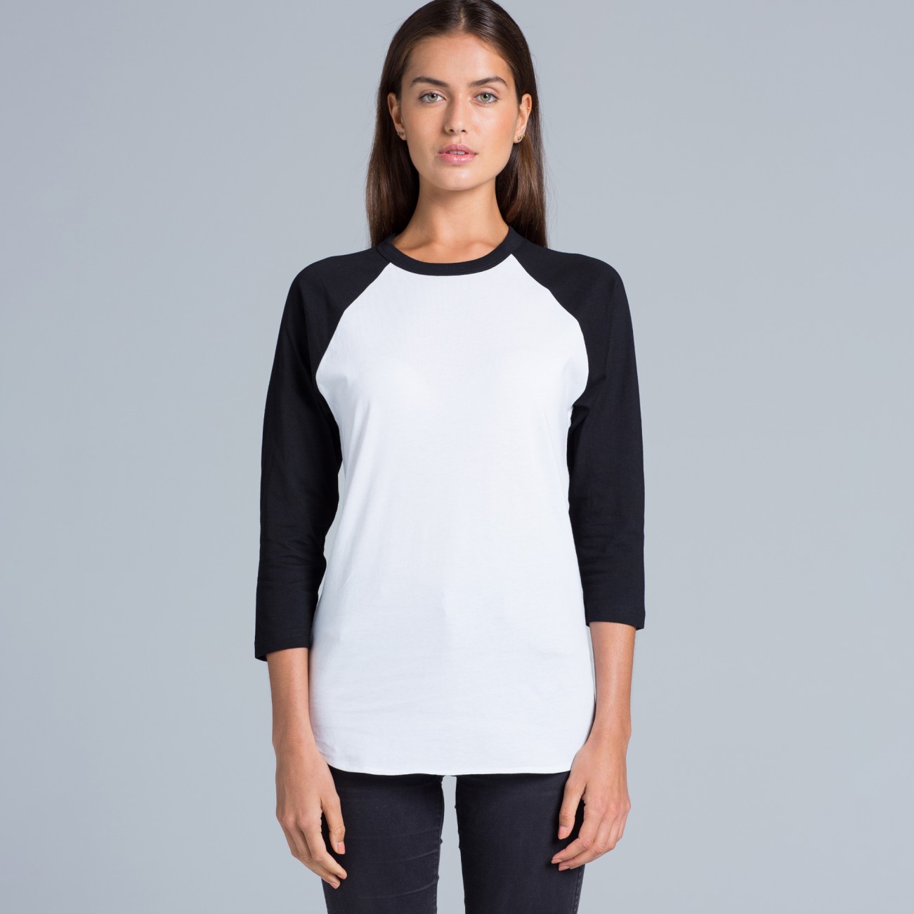 Crew neck, ¾ length raglan sleeves, curved tails